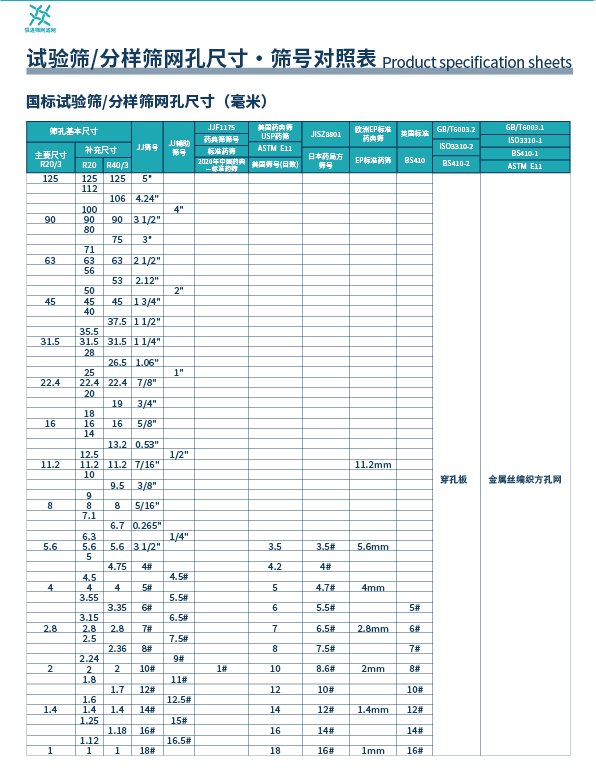 ASTME11、BS410、DIN4188、AFNOR NFX11-501